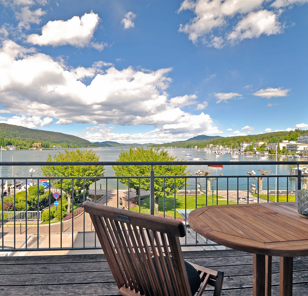 Die große Wohnküche und insbesondere der Balkon bieten einen nahezu einmaligen Blick auf den Wörthersee und in die